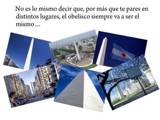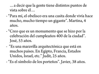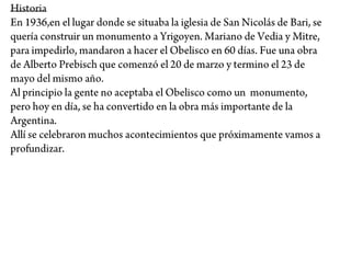 El documento habla brevemente sobre el Obelisco de la ciudad de Buenos Aires. Describe su construcción y menciona que en algunas ocasiones ha sido decorado con la bandera de Argentina y Alemania y también con un condón para promover la prevención del VIH.