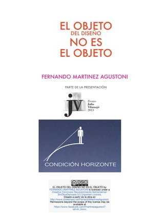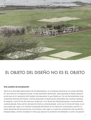 El documento argumenta que el objeto no es el objetivo central del diseño. Define el diseño como la "actualización de las soluciones a los problemas emergentes de la interacción del ser humano con el hábitat", lo que implica ir más allá de la mera creación de objetos. Distingue el diseño de la innovación, señalando que el diseño implica tanto el cambio como la preservación del pasado.