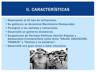 Manuel A. Odría asumió el poder en Perú mediante un golpe de estado en 1948 y gobernó por 8 años como dictador. Promovió la educación y la salud pública pero también persiguió a la oposición. Dejó el poder en 1956 luego de que estallaran protestas en su contra en Arequipa y tras llegar a un acuerdo secreto con el sucesor electo, Manuel Prado, para evitar investigaciones sobre la corrupción durante su gobierno.