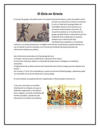 El documento analiza el concepto de ocio en la antigua Grecia y Roma. En Grecia, el ocio solo podía existir para los hombres libres y se mantenía gracias a la esclavitud. El ocio griego estaba ligado a grandes fiestas y espectáculos religiosos que servían para cohesionar al pueblo. En Roma, el ocio se fusionó con los negocios y se convirtió en un arma para dominar a las masas a través de espectáculos, en lugar de estar ligado a ideales intelectuales como