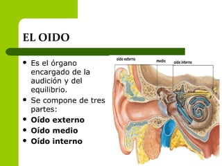 El documento describe la anatomía del oído humano, abordando sus tres partes: oído externo, medio e interno. Se detallan las estructuras principales y funciones, así como condiciones patológicas como otitis y perforaciones de la membrana timpánica. También se menciona la importancia de la evaluación clínica y el examen otoscópico en la diagnosis de afecciones auditivas.