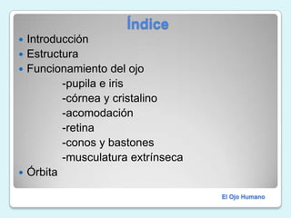 El documento describe la estructura y funcionamiento del ojo humano, incluyendo la pupila, iris, córnea, cristalino, retina, conos y bastones. Explica cómo el ojo recibe estímulos luminosos y forma una imagen en la retina, la cual es interpretada por el cerebro. También cubre la órbita, exámenes oculares y cuatro errores de refracción principales: miopía, hipermetropía, astigmatismo y presbicia.