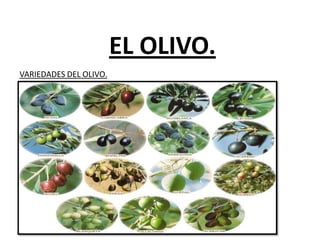 Este documento trata sobre el olivo y la aceituna. Incluye secciones sobre variedades de olivo, su composición, características de la aceituna, gastronomía relacionada como ensaladas y recetas con aceituna, y una receta de presa ibérica con salsa de aceituna y mostaza. También proporciona la dirección de un blog dedicado a compartir más información sobre la aceituna.