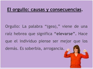 El documento habla sobre el orgullo, sus causas y consecuencias. Explica que el orgullo hace que las personas se sientan superiores a los demás y fue el primer pecado de Satanás. Las posibles causas del orgullo incluyen la sobreestimación personal, atribuirse méritos que pertenecen a Dios, y tener un corazón vanidoso. Las consecuencias son el destronamiento de cualquier posición, conducir a la crueldad, y preparar el escenario para el fracaso. La humildad es la mejor forma para los cristianos