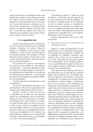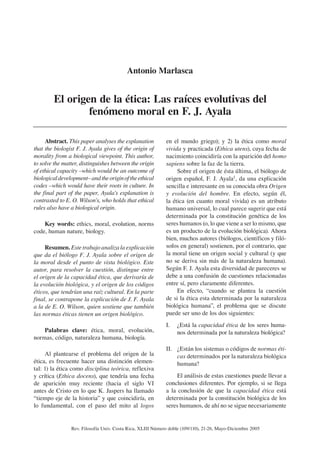 Este documento analiza las explicaciones de F.J. Ayala y E.O. Wilson sobre el origen de la ética. Ayala distingue entre la capacidad ética, determinada biológicamente, y los códigos éticos, de origen cultural. Explica que la capacidad ética surgió en los humanos debido a su gran inteligencia y habilidad para anticipar consecuencias, hacer juicios de valor y elegir acciones. Wilson sostiene que también las normas éticas tienen un origen biológico. El documento contrasta ambas posiciones