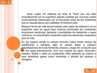 Este documento resume las principales teorías sobre el origen de la vida en la Tierra, incluyendo la teoría de la abiogénesis que propone que la vida surgió de materia inanimada a través de procesos químicos naturales. Describe experimentos clave realizados por científicos como Redi, Van Leeuwenhoek, Needham, Spallanzani y Pasteur que ayudaron a refutar la teoría de la generación espontánea y establecer que los microorganismos se originan de otros microorganismos preexist