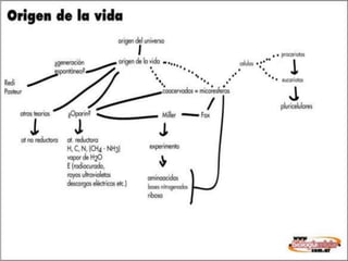El documento presenta diferentes teorías sobre el origen de la vida en la Tierra. Expone que la vida pudo haber surgido a partir de moléculas orgánicas que se formaron de manera espontánea en la atmósfera primitiva de la Tierra, como demostraron los experimentos de Miller y Urey. Luego, estas moléculas pudieron haberse agrupado en estructuras celulares primitivas llamadas coacervados, que evolucionaron hasta formas de vida más complejas. El documento también resume una entrevista a un científico que
