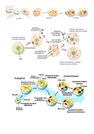 Las teorías sobre el origen de los eucariotas incluyen: 1) la teoría autogénica que explica el origen de los orgánulos asociados al sistema de endomembranas pero no la aparición de mitocondrias y cloroplastos; 2) la hipótesis de la fagocitosis que sostiene que mitocondrias y cloroplastos son procariontes fagocitados; y 3) la teoría endosimbiótica que postula que mitocondrias y cloroplastos se originaron a partir de la fus