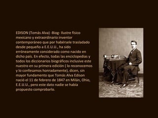 El documento corrige la información errónea sobre el lugar y fecha de nacimiento de Thomas Edison. A través de cartas y documentos históricos, se establece que Edison nació el 18 de febrero de 1848 en Sombrerete, Zacatecas, México y no en 1847 en Ohio, Estados Unidos. Se detallan los orígenes mexicanos de Edison y su familia antes de que emigrara a los Estados Unidos de joven.