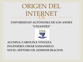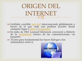 El documento describe los orígenes de Internet. J.C.R. Licklider concibió una red global interconectada para compartir datos y programas. En 1961, Leonard Kleinrock convenció a otros de la viabilidad teórica de las comunicaciones vía paquetes. En 1965, Roberts conectó dos computadoras a través de una línea telefónica, demostrando que las computadoras podían trabajar juntas. Esto llevó al desarrollo de ARPANET y la primera red embrionaria se completó en 1969 con cuatro computadoras conectadas.