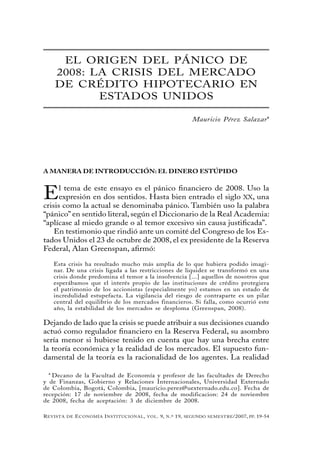 Este documento analiza el origen del pánico financiero de 2008, que se desencadenó por la crisis del mercado de crédito hipotecario en Estados Unidos. Explica que se formó una burbuja en el mercado hipotecario estadounidense, donde los precios de las viviendas se desvincularon de su valor real. También describe las tres etapas típicas de una burbuja financiera - aumento de precios, entrada de nuevos inversionistas y colapso - y cómo este proceso llevó a la crisis global. Finalmente, resume las resp