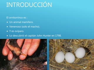 El documento resume las características del ornitorrinco, un mamífero ovíparo que fue descubierto en 1798. Mide hasta 50 cm de largo, pesa entre 1 y 2 kilos, tiene pico de pato, patas de nutria y cola de castor. Se alimenta de crustáceos, moluscos e insectos pequeños. Construye túneles bajo tierra donde las hembras ponen hasta 3 huevos. Está protegido desde 1905 pero su población ha disminuido debido a la introducción de zorros rojos y un h