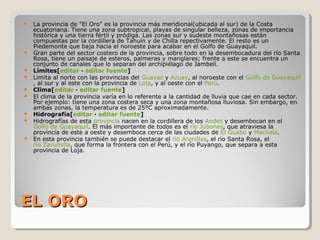 La provincia de El Oro se encuentra en la costa sur de Ecuador y tiene zonas montañosas, costeras y de piedemonte. El clima varía entre seco en la costa y lluvioso en las montañas, aunque la temperatura promedio es de 25°C en ambas zonas. Los ríos más importantes son el Jubones, Santa Rosa y Zarumilla, este último forma la frontera con Perú.