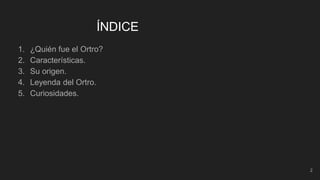 Este documento presenta un resumen sobre el Ortro, una criatura mitológica de la mitología griega. Se divide en secciones que describen quién fue el Ortro, sus características, su origen y dos leyendas asociadas con él. También incluye algunas curiosidades sobre el Ortro y su relación con otros seres mitológicos como el Cancerbero.