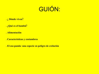 El oso panda vive en los bosques de bambú de China, donde se alimenta principalmente de este vegetal debido a su bajo valor nutricional. A pesar de ser omnívoros, los pandas dependen casi exclusivamente del bambú. Sin embargo, la destrucción de sus hábitats y las dificultades para reproducirse han puesto a la especie en peligro de extinción.