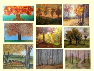 El documento describe las características del otoño, incluyendo que los árboles cambian de color a rojo, amarillo y marrón, las hojas comienzan a caer y cubren el suelo, es época de frutos secos y setas, y hace más frío por lo que hay que abrigarse para salir. También menciona que es tiempo de volver a la escuela.