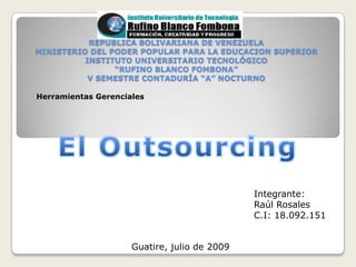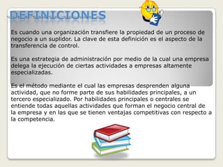 El documento define el outsourcing como la estrategia de delegar ciertas actividades no centrales a empresas especializadas para reducir costos y concentrarse en las habilidades principales. Explica que aunque inicialmente las empresas intentaban controlar todas las actividades, con el tiempo se hizo obsoleto y el outsourcing ganó popularidad en los 70 como forma de acceder a personal altamente capacitado y tecnología actualizada de manera más eficiente y económica. También identifica riesgos como contratos inadecuados y dependencia externa.
