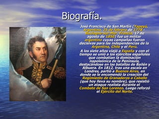 San Martín fue un militar argentino clave en las independencias de Argentina, Chile y Perú. Sirvió en el ejército español desde los 11 años y luchó contra las fuerzas de Napoleón. En 1812 fue enviado a Buenos Aires donde creó el Regimiento de Granaderos a Caballo. Dirigió la victoria sobre los realistas en el Combate de San Lorenzo en 1813. Más tarde lideró campañas que liberaron a Argentina, Chile y Perú del dominio español.