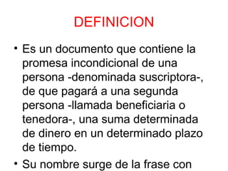 El documento define el pagaré como un documento que contiene la promesa incondicional de pagar una suma de dinero en un plazo determinado. Históricamente, el pagaré se creó como un título análogo a la letra de cambio para ocultar préstamos bajo la apariencia de deudas comerciales. Un pagaré válido debe incluir la mención de ser un pagaré, la suma a pagar, el beneficiario, la fecha y lugar de pago, y la firma del suscriptor.