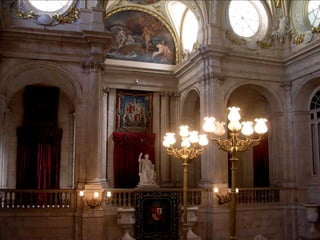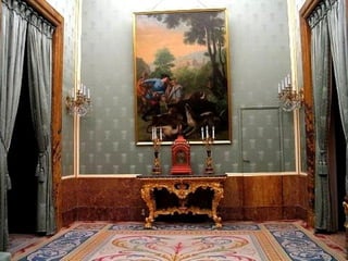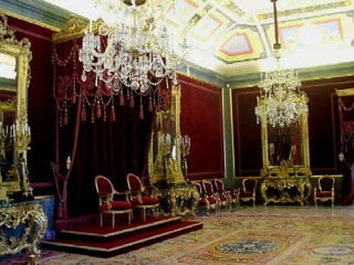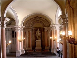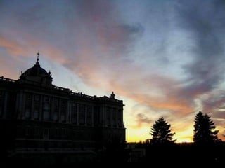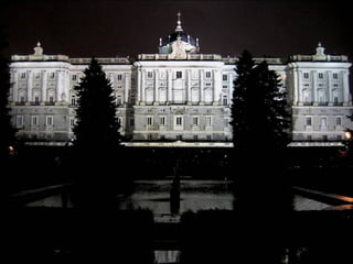 El documento describe la historia y características del Palacio Real de Madrid. Comenzó como un castillo musulmán que fue transformado en alcázar por los Reyes de Castilla. Sufrió un incendio en 1734 y fue reconstruido por Felipe V con un nuevo diseño. Desde entonces, ha sido la residencia de la mayoría de los reyes de España hasta la actualidad y alberga importantes obras de arte.