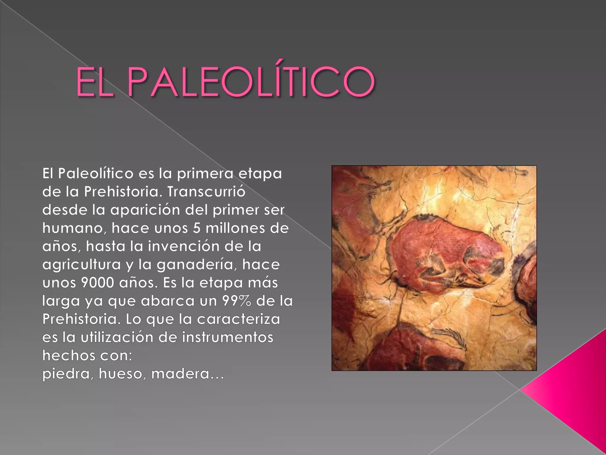 El Paleolítico fue la primera etapa de la Prehistoria que duró desde hace 5 millones de años hasta hace 9000 años, caracterizada por el uso de herramientas de piedra, hueso y madera. Los primeros humanos aparecieron en África hace 4 millones de años y luego se expandieron a Europa, Asia y América del Norte, donde habitaron en cuevas y valles protegidos. Durante este período vivieron especies humanas antepasadas como los australopitecos y el Homo sapiens, organizados en pequeñas tribus que des