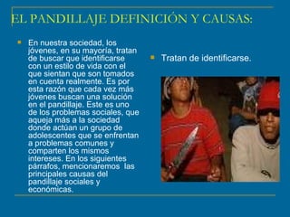 El documento habla sobre las causas y consecuencias del pandillaje entre los jóvenes. Algunas de las principales causas son la desintegración familiar, la falta de educación y la búsqueda de identidad y pertenencia. Los jóvenes se unen a pandillas debido a carencias afectivas y la falta de valores. Esto lleva a consecuencias negativas como la delincuencia y la violencia. Se proponen soluciones como el apoyo a las familias, la rehabilitación de los jóvenes y la promoción del deporte.