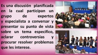 El panel de discusión es un formato comunicativo donde expertos presentan y discuten un tema de interés general o polémico, con el objetivo de aclarar controversias y resolver problemas. Este incluye un moderador, panelistas y un público que puede participar haciendo preguntas y comentarios. Existen diferentes tipos de paneles, como especializados, públicos y mixtos, cada uno con características distintas.