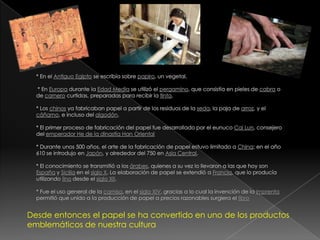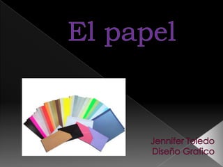 El documento describe los diferentes tipos de pasta de papel y papeles. Detalla las pastas mecánica, morena, química, de paja y de recortes que se usan para hacer diferentes calidades y usos de papel. Luego enumera varios tipos de papel como el cristal, de estraza, kraft, liner y cartón, entre otros. Finalmente, describe brevemente algunos usos comunes de papel como para corrugar, impresión, cartulinas y periódicos.