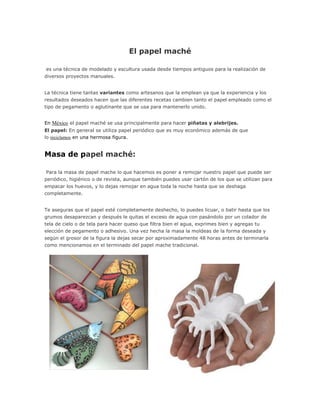 El papel maché es una técnica de modelado y escultura que ha sido usada desde la antigüedad, en la cual se mezcla papel deshecho con un aglutinante como pegamento o cola para moldear figuras. La técnica tiene variantes dependiendo del material y resultados deseados, y en México se usa principalmente para hacer piñatas y alebrijes. Para preparar la mezcla del papel maché, se remoja el papel en agua toda la noche, luego se licúa o bate hasta deshacer los grumos y quitar el ex