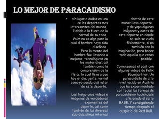 El documento describe las diferentes formas de practicar paracaidismo, desde saltos en tándem con un instructor hasta cursos completos de paracaidismo. Explica opciones como bautismos de dos saltos con entrenamiento teórico, la iniciación al curso de progresión acelerada en caída libre, y el curso completo de paracaidismo de siete saltos para obtener la calificación. También resume brevemente el reglamento de paracaidismo en España y su objetivo de actualizar periódicamente la normativa de acuerdo con los cambios