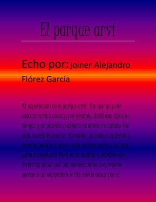 El autor describe su experiencia en el parque arví, donde pudo observar diversos tipos de hongos, plantas y árboles. También exploró la cañada y cruzó puentes, incluyendo uno que le dio miedo a un compañero debido a que la suela de su zapato era lisa. La excursión por el bosque fue una diversión para el autor y sus acompañantes.