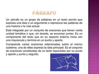 El documento define un párrafo como un grupo de oraciones relacionadas que expresan una idea principal y secundarias. Explica que un párrafo contiene una oración principal y oraciones de apoyo coordinadas o subordinadas. Además, describe los tipos de párrafos (narrativo, descriptivo, argumentativo, expositivo) y los formatos de párrafos (ordinario, moderno, en forma de sumario).