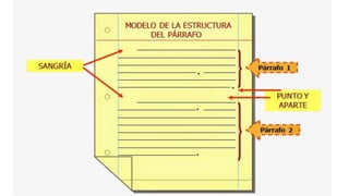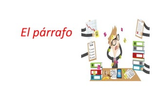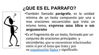 El documento define el párrafo y describe sus características y tipos. Un párrafo es la unidad mínima de un texto compuesto por una o más oraciones relacionadas que tratan un mismo tema u idea. Los párrafos pueden ser de introducción, desarrollo o conclusión, y se clasifican según su contenido en narrativos, descriptivos, argumentativos u otros. Además, se describen las ideas principales y secundarias, y la estructura de un párrafo bien construido.