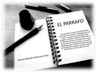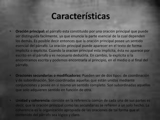 Este documento describe las características de un párrafo efectivo. Explica que un párrafo contiene una oración principal y oraciones secundarias que apoyan la idea principal. También debe tener unidad y coherencia para que el mensaje sea claro. Luego, detalla diferentes tipos de párrafos como argumentativo, descriptivo, narrativo y más. Finalmente, concluye que un párrafo es una unidad lógica de pensamiento que expresa ideas principales y secundarias de manera cohesiva.
