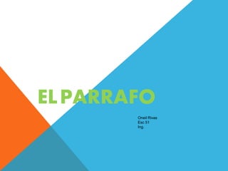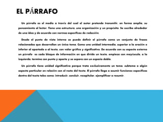 Este documento define el párrafo y describe sus características principales. Explica que un párrafo es una unidad de texto que trata un único tema y tiene una estructura interna definida. Además, detalla los diferentes tipos de párrafos según su función y estructura, así como aspectos relacionados con su composición tipográfica como la sangría, justificación y extensión.