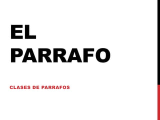 Este documento describe las características y tipos de párrafos. Un párrafo es una unidad de texto escrito que desarrolla una idea principal mediante oraciones relacionadas. Los párrafos tienen una estructura semántica basada en una idea temática y detalles complementarios, y una estructura formal compuesta por varias oraciones conectadas. Los párrafos se caracterizan por la unidad, cohesión y extensión variable. Existen párrafos funcionales como los introductorios, de enlace y conclusivos, así como párra