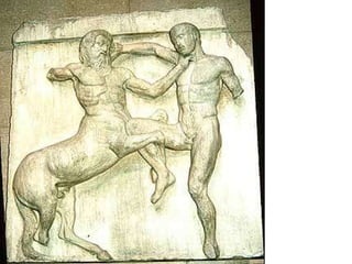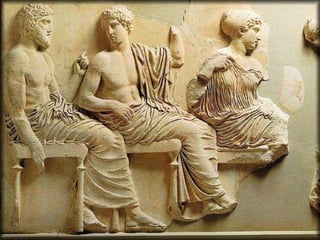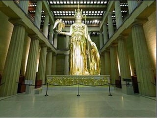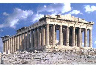 El documento describe varias obras arquitectónicas y escultóricas de la Acrópolis de Atenas, incluyendo el Partenón. Se destaca la importancia del escultor Fidias, quien creó las esculturas del Partenón, incluyendo el friso y los frontones, que muestran su genialidad y dominio de la anatomía humana y el movimiento.