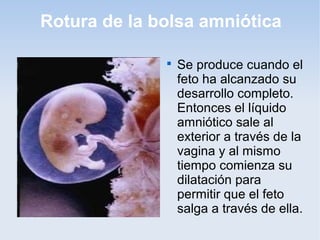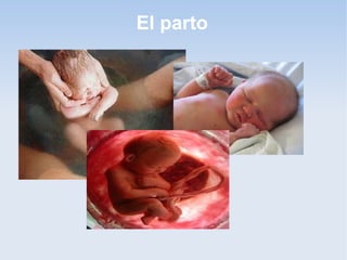 El documento resume las diferentes etapas del parto, incluyendo la rotura de la bolsa amniótica, la expulsión del bebé, el alumbramiento y los síntomas del preparto. También describe brevemente el cordón umbilical, la lactancia, la cesárea y los autores del documento.