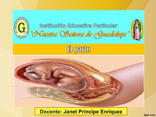 El documento describe las tres etapas del proceso de parto: 1) la dilatación del cuello del útero, 2) la expulsión del bebé a través de la vagina cortando el cordón umbilical, y 3) la expulsión de la placenta del útero unos 5 a 10 minutos después del nacimiento. También define algunos términos clave relacionados con el embarazo y el parto.