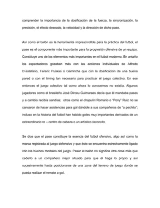 Este documento describe la importancia del pase en el fútbol y diferentes tipos de pases. Explica que el pase es la transferencia de la pelota de un jugador a otro para progresar de forma ofensiva. Detalla clasificaciones de pases por velocidad, dirección, trayectoria e intención táctica. También ofrece consejos para realizar buenos pases y define brevemente varios tipos específicos de pases como el pase al hueco y el pase entre líneas.