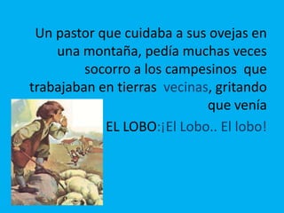 Un pastor mentiroso que cuidaba sus ovejas en la montaña solía gritar falsamente que el lobo venía para asustar a los campesinos cercanos, pero cuando el lobo realmente atacó, los campesinos no acudieron a ayudarlo porque pensaron que era otra mentira, y el lobo mató muchas ovejas.