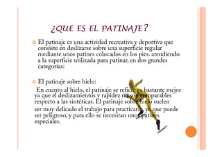 El documento describe el patinaje como una actividad recreativa y deportiva que consiste en deslizarse sobre una superficie regular usando patines. Explica que existen dos tipos principales de patinaje: sobre hielo y sobre ruedas. También detalla algunos de los beneficios del patinaje para la salud y la forma, y describe brevemente la biomecánica básica del patinaje.