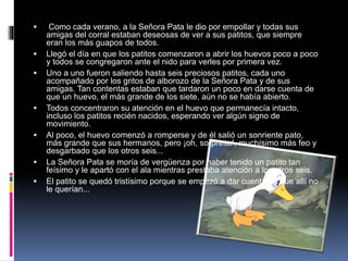 El patito feo nació feo y desgarbado, siendo rechazado por su madre y hermanos. Huye de su granja y pasa un invierno difícil hasta que llega a un estanque donde conoce a unos cisnes. Al verse su reflejo descubre que durante el invierno se había transformado en un hermoso cisne blanco y elegante.