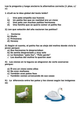 Este documento presenta los resultados de una evaluación de habilidades de lenguaje y comunicación aplicada a un estudiante de segundo año básico. La evaluación incluye pruebas de comprensión lectora y producción de textos. En la sección de comprensión lectora, el estudiante responde preguntas sobre un cuento llamado "El Patito Feo". En la sección de producción de textos, se le pide al estudiante que continúe escribiendo el cuento.