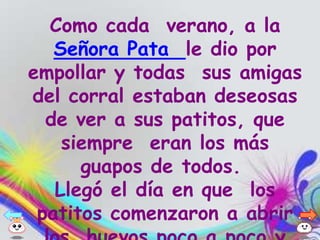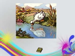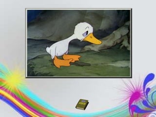 El patito feo nació diferente a sus hermanos y fue rechazado por su madre y hermanos por ser más grande y feo. Pasó el invierno solo y hambriento hasta que encontró un estanque con cisnes elegantes, quienes le dijeron que era uno de ellos. Al verse en el agua, se dio cuenta de que se había transformado en un hermoso cisne blanco.
