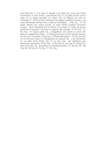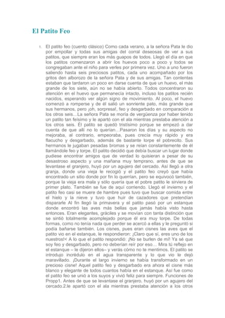 El cuento narra la historia de un patito feo que nace en una granja y es rechazado por su madre y hermanos por su apariencia. Huye de la granja y pasa por varias dificultades hasta que llega la primavera y encuentra un estanque con cisnes. Al verse reflejado en el agua, descubre que se ha transformado en un hermoso cisne blanco.