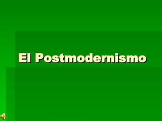 El documento habla sobre las características del posmodernismo como una corriente de desconstrucción y desenmascaramiento que implica la muerte de la razón y la negación de la lógica histórica, el progreso y la idea de que el cambio social ha terminado. Desde el arte, rechaza la función crítica del arte y los valores de funcionalidad y racionalidad.
