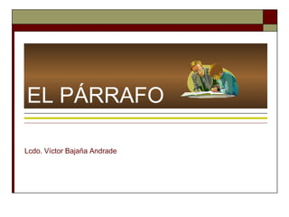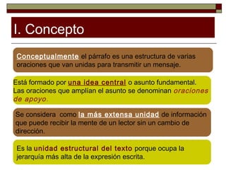 El documento define el concepto de párrafo y describe sus componentes principales. Un párrafo consiste en una idea central o tesis y oraciones de apoyo que amplían la idea. También se compone de una introducción, un cuerpo con ideas de desarrollo y una conclusión. Los párrafos se ordenan comúnmente de forma cronológica, espacial, causal u otros métodos y deben lograr coherencia, unidad y variedad.
