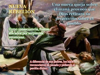 El documento resume los eventos clave de los israelitas después de salir de Egipto mientras viajaban hacia Canaán. Primero, se les negó el paso a través de Edom y Moab pero lograron comprar provisiones. Luego derrotaron a los cananeos de Arad, al rey amorreo Sehón de Hesbón y tomaron su territorio, y al rey Og de Basán y tomaron su tierra también. Con esto, había comenzado la conquista de Canaán.