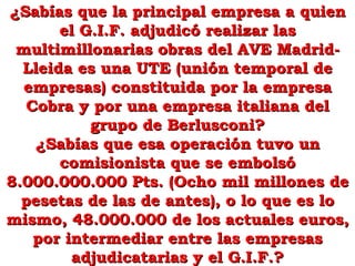 El documento describe cómo el Partido Popular adjudicó la construcción del AVE Madrid-Barcelona a empresas allegadas. Un comisionista llamado Alejandro Agag, quien se casó con la hija de Aznar, se embolsó 48 millones de euros por el proyecto. La parada del AVE en Yebes en lugar de Guadalajara capital benefició a terratenientes conectados con el PP que podrán urbanizar sus tierras.
